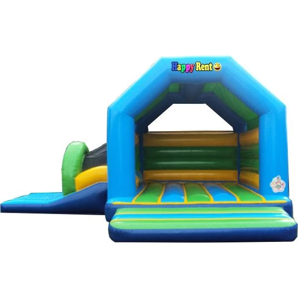 Dit springkussen heeft niet alleen een glijbaan maar ook een dak, doordat het springkussen overdekt is zijn de kinderen ook beschermt tegen felle zon en lichte neerslag, zelfs de glijbaan heeft een dakje.