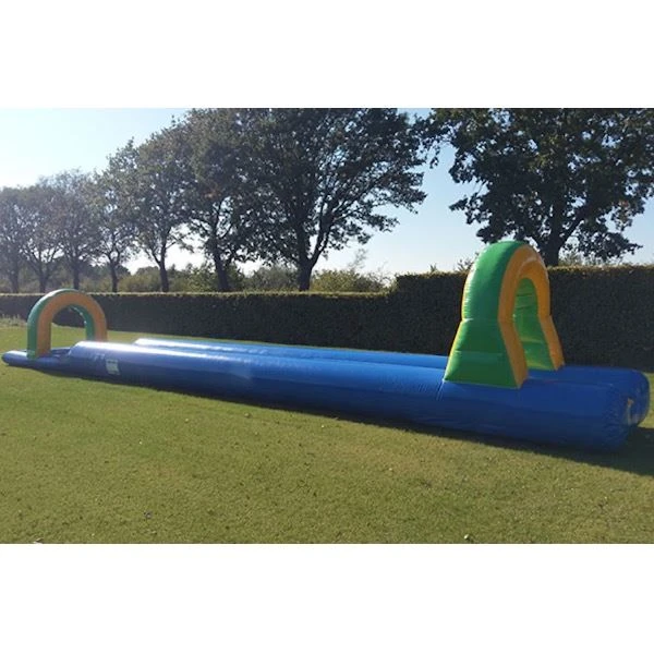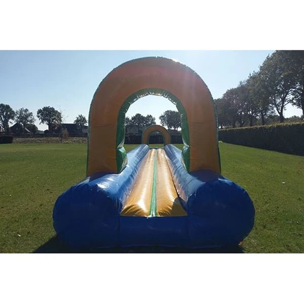 Je kunt deze opblaasbare buikschuifbaan met enkel water gebruiken, met een goede aanloop haal jij dan net wel of nét niet het eindbad met water. Als je extra supersnel wilt glijden is het mogelijk om zeep te gebruiken op de buikschuifbaan, wij adviseren groene zeep voor het beste resultaat, maar je mag ook afwasmiddel gebruiken. Na gebruik dient de baan wel weer droog en schoon geretourneerd te worden dus plan ook wat tijd in om de baan weer te drogen. Is 15 meter niet lang genoeg? We hebben ook een XXL Buikschuifbaan van 23 meter te huur in Brabant.