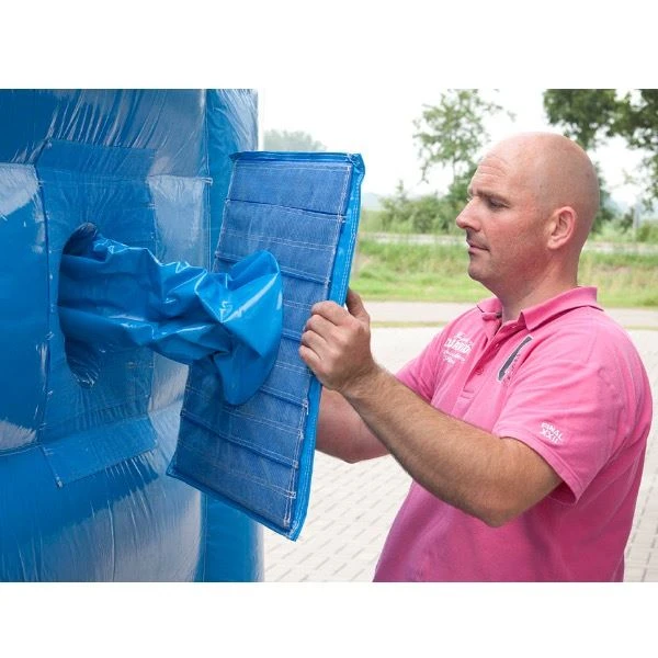 Indien je de Bungee Run op een harde ondergrond plaatst, bijvoorbeeld asfalt of tegels, dien je bij de open delen valmatten te leggen. Mocht je deze niet in bezit hebben dan kun je deze makkelijk bij bestellen in het bestelmenu. Wanneer iemand uit het kussen valt komt hij/zij zachtjes op de matten terecht. Indien de Bungee Run op een zachte ondergrond geplaatst wordt, zijn de valmatten niet verplicht.