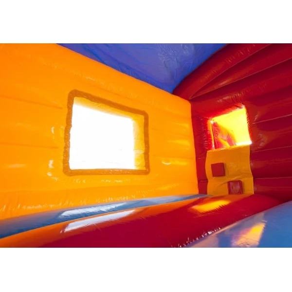 Dit multifun springkussen mét glijbaan is maar 3,7 Meter breed en daarmee een mooi smal springkussen dat makkelijk te plaatsen is in bijvoorbeeld een oprit of voortuin.