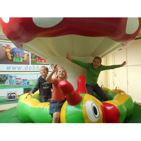 De draaimolen staat op een aanhanger waarvan de zijkanten openklappen. daarna worden de rups en de paddenstoel opgeblazen.