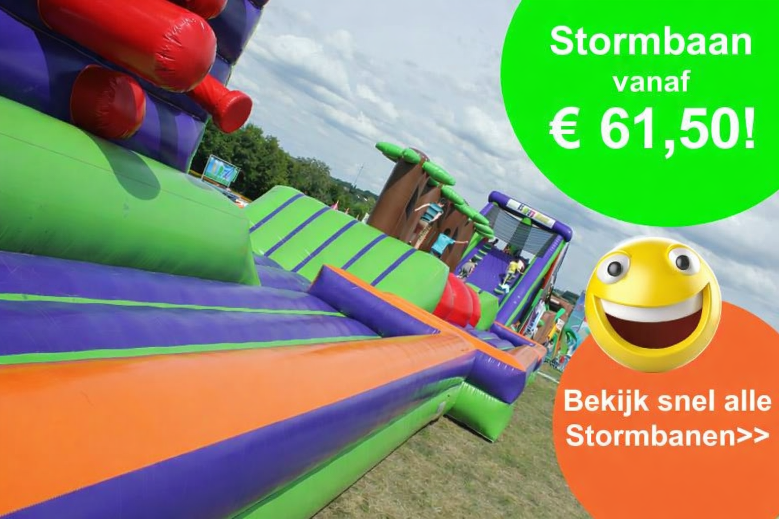 Een stormbaan goedkoop huren kan direct online bij Happy Rent Attractieverhuur uit Limburg, zo huurt u al een stormbaan vanaf € 61,50! Klik hier voor alle modellen: