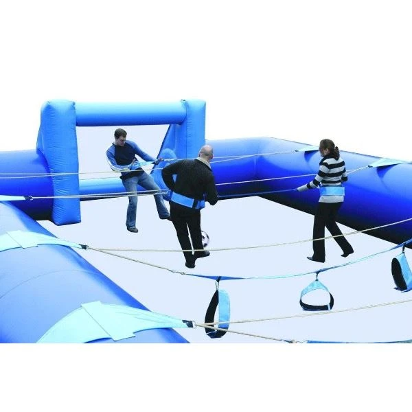 De deelnemers houden zich aan de touwen in het levend tafelvoetbalspel vast waardoor ze als echte speel poppetjes in het veld bewegen. De afmeting van dit levend voetbalspel zonder bodem is 14 x 8 x 1,2 Meter en wordt geleverd inclusief voetbal, blower en toebehoren. Een echte aanrader voor iedere (voetbal) vereniging, elk teamuitstapje of zeskamp en zeker tijdens het EK of WK een echte top attractie om te huren.