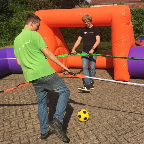 De deelnemers houden zich aan de touwen in het levend tafelvoetbalspel vast waardoor ze als echte speel poppetjes in het veld bewegen. De afmeting van dit levend voetbalspel zonder bodem is 7 x 11 x 2 Meter en wordt geleverd inclusief voetbal, blower en toebehoren. Een echte aanrader voor iedere (voetbal) vereniging, elk teamuitstapje of zeskamp en zeker tijdens het EK of WK een echte top attractie om te huren.