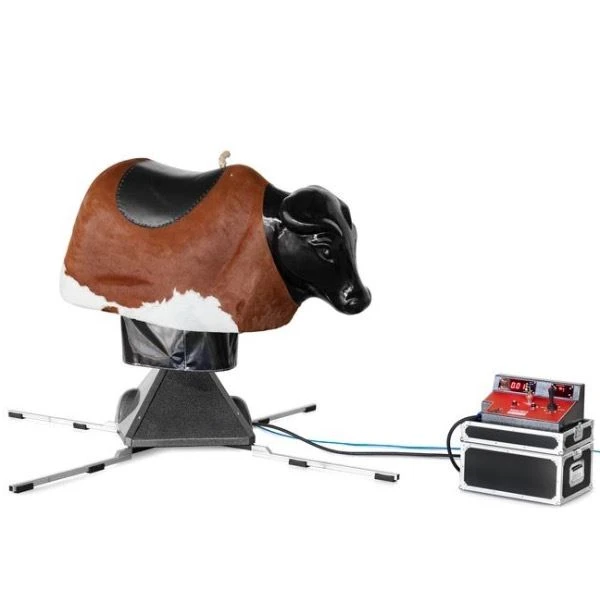 Deze rodeostier is ook te huur als surfsimulator of als voetbal rodeo