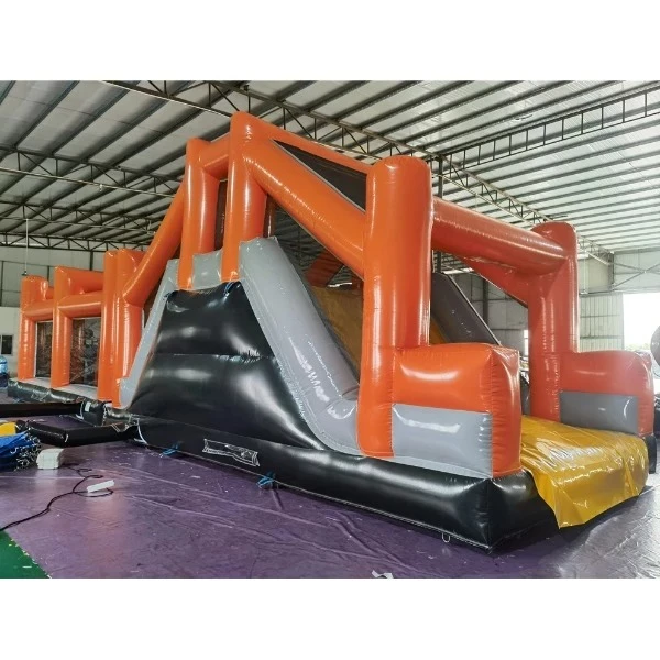 De Stormbaan 14m begint met een speels instapgedeelte waar deelnemers meteen worden getest op snelheid. Daarna volgen zachte obstakels, klimonderdelen en tunnels waar je doorheen moet kruipen om zo snel mogelijk verder te gaan. Halverwege de baan komt het klimgedeelte dat naar de glijbaan leidt — hét moment waarop publiek en deelnemers extra spanning ervaren. Eenmaal boven glijd je met volle vaart naar beneden, klaar om de laatste meters af te leggen richting de finishlijn.