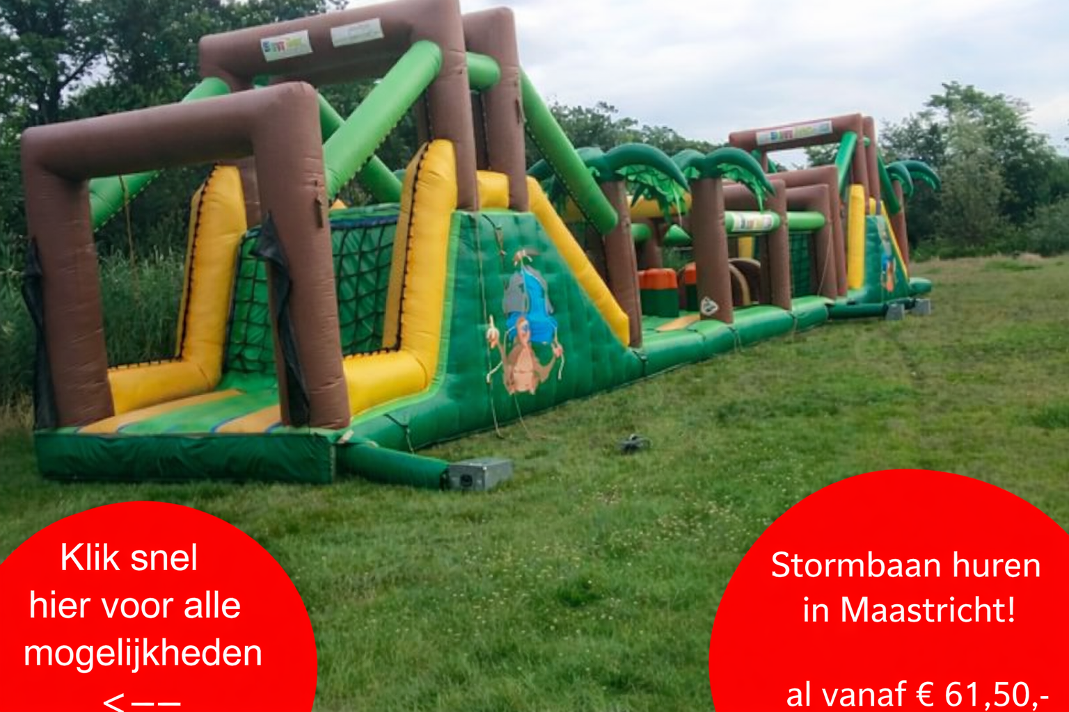 Komt u uit Maastricht of omstreken en geeft u binnenkort een feest of een evenement? U wilt uw gasten vermaken met wat extra entertainment. Wij bij Happy Rent kunnen u daarmee helpen. Bijvoorbeeld door uw gasten een geweldige tijd te bezorgen met een van onze vele stormbanen. Dus wilt u een stormbaan huren in de buurt van Maastricht. Dit is geen probleem voor ons. U kunt de stormbaan bij ons in Heerlen komen ophalen bijvoorbeeld. Ook als u in Meerssen, Eijsden of in Lanaken. Voor uw eigen gemak laat ons de stormbaan bij u afleveren, opbouwen, afbreken en weer mee terugnemen.