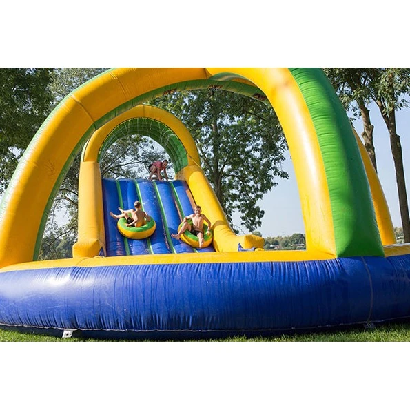 Let erop dat het vullen van het zwembad enkele uren in beslag neemt. Je dient dan ook zelf te zorgen voor het wateraanvoer. De afmetingen van de tobbedans is 17.0 x 6.0 x 6.0 M en de baan weegt 280 KG. Bij het opzetten van deze topattractie zijn er 4 vrijwilligers nodig.