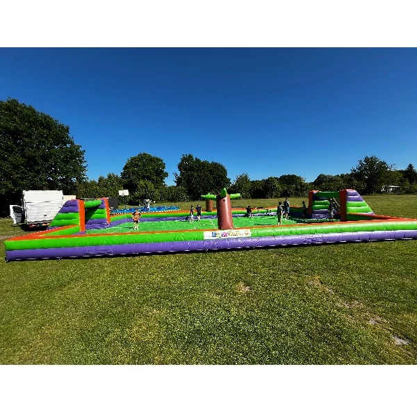 Deze veelzijdige opblaasbare zeepbaan van 20x10 meter biedt eindeloos vermaak voor jong en oud. Of je nu kiest voor een hilarisch potje zeepvoetbal of een spannend spelletje voetvolley, deze attractie staat garant voor lachen, glijden en scoren!