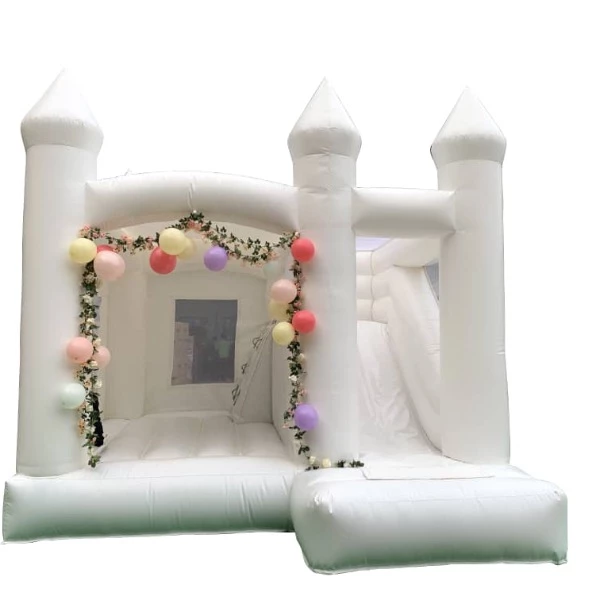 Maak je bruiloft onvergetelijk met ons prachtige witte springkussen met glijbaan!